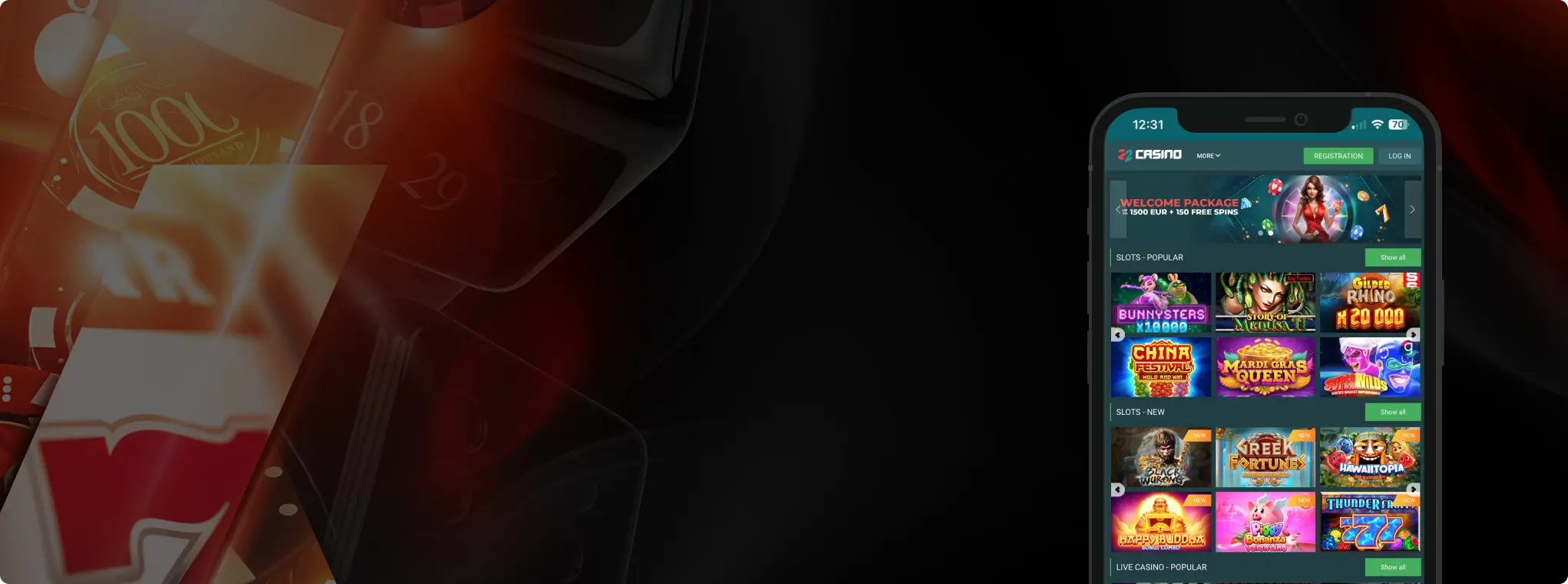 - Permainan kasino – slot, meja live dealer, instant games.